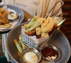 Veggie spring rolls, chicken-ish karaage, calamarings, edamame chips & sweet potato chips