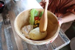 Potato with flavoured Spanish onion and cucumber, topped with sweet corn and mayo. Smash and mix it yourself!!