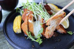 Deep-fried pork-ish cutlet with wasabi tartare sauce + Salad with spicy garlic dressing