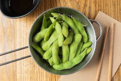 Boiled soy beans in the pod marinated with Himalayan pink salt